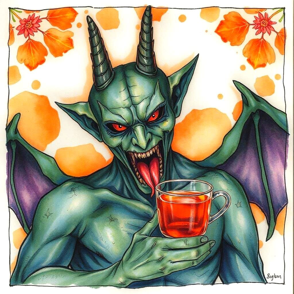 This image depicts a mocking devil rendered in a stained tea watercolor style. The artwork captures the subject's mischievous nature through subtle color variations.