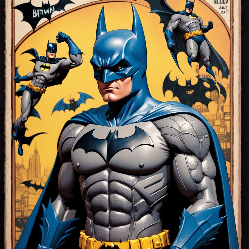 A close-up concept art of a vintage action figure Batman in a yellow and blue bat suit, standing upright in a collector's box set, with intricate details and nostalgic retro style reminiscent of classic comic book illustrations.