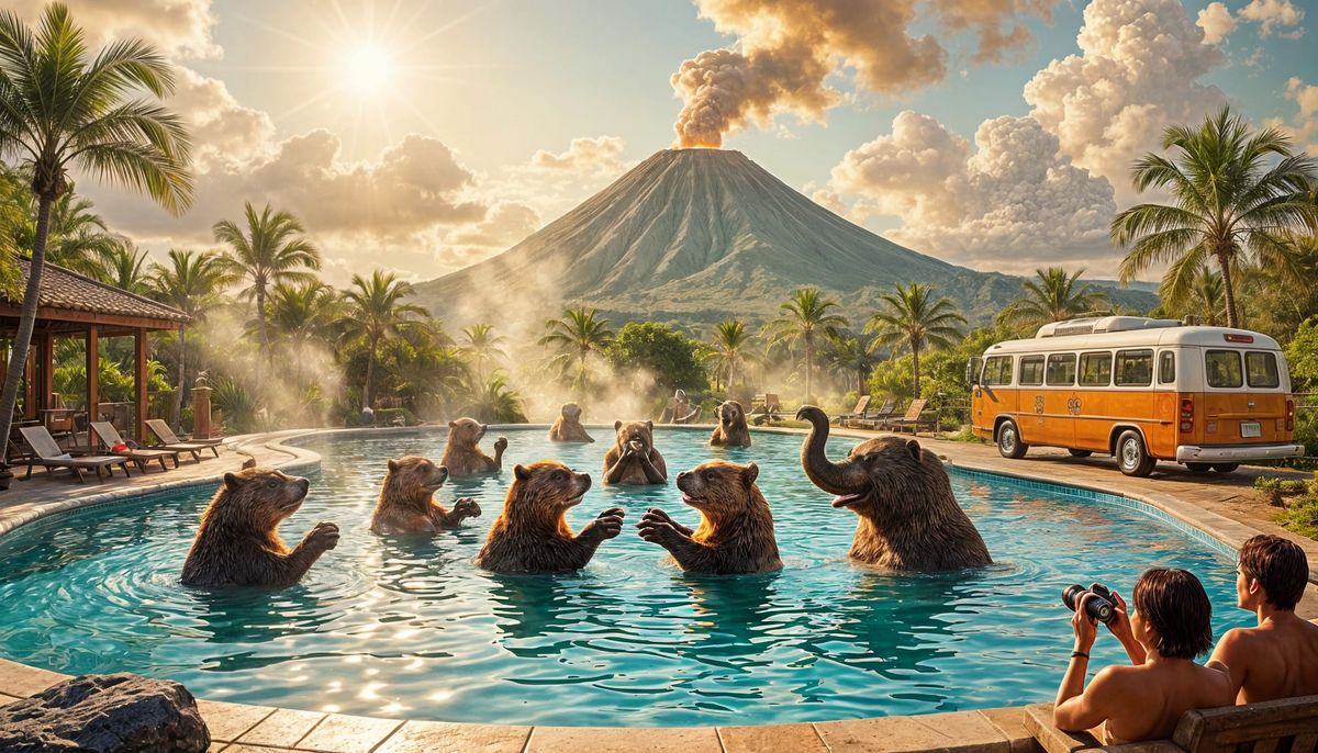 This image depicts anthropomorphic animals joyfully dancing in a vibrant, golden-lit swimming pool. A distant volcano erupts as a tour bus observes the surreal scene.