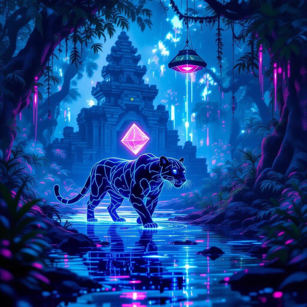 A translucent glass panther with glowing blue veins moves through a surreal neon jungle. Concept art with a low-angle cinematic view, featuring shimmering reflections and ambient glow.