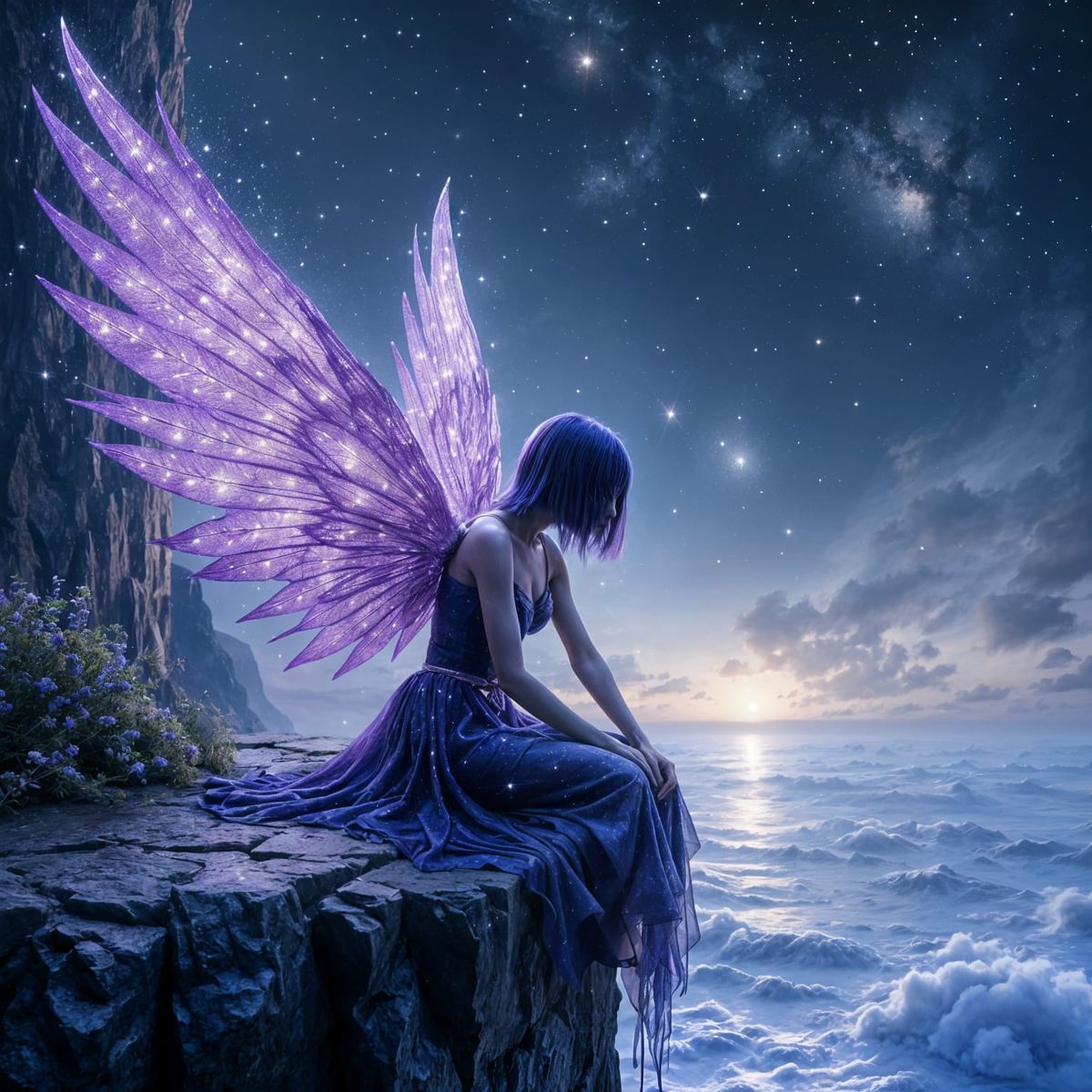 This image shows a female angel with purple hair and flowing stardust wings, perched above a cosmic sea. Rendered in ultra CGI with an ethereal, dreamlike quality.