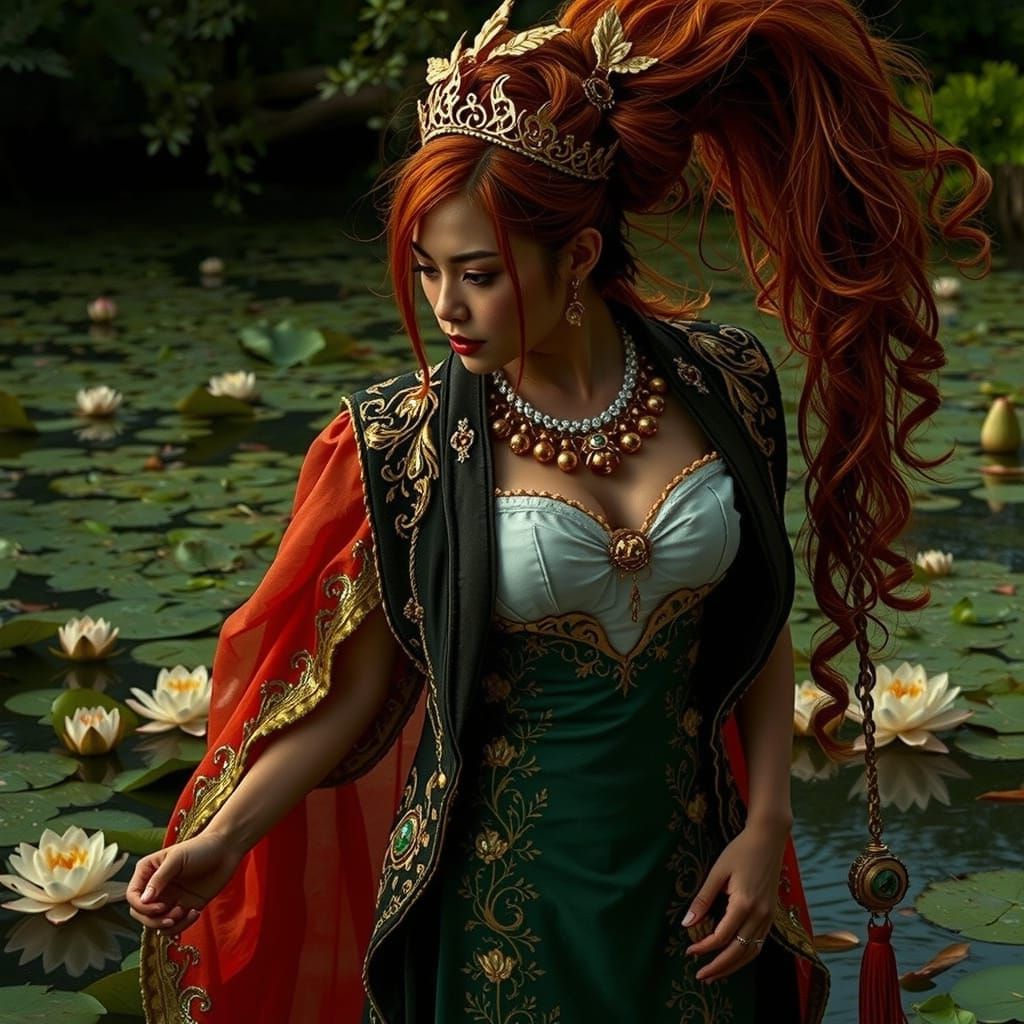 This image shows two figures in elaborate costumes embracing amidst a lush floral pond. The attire is richly detailed with lace craft and intricate golden motifs against a flourishing forest backdrop.