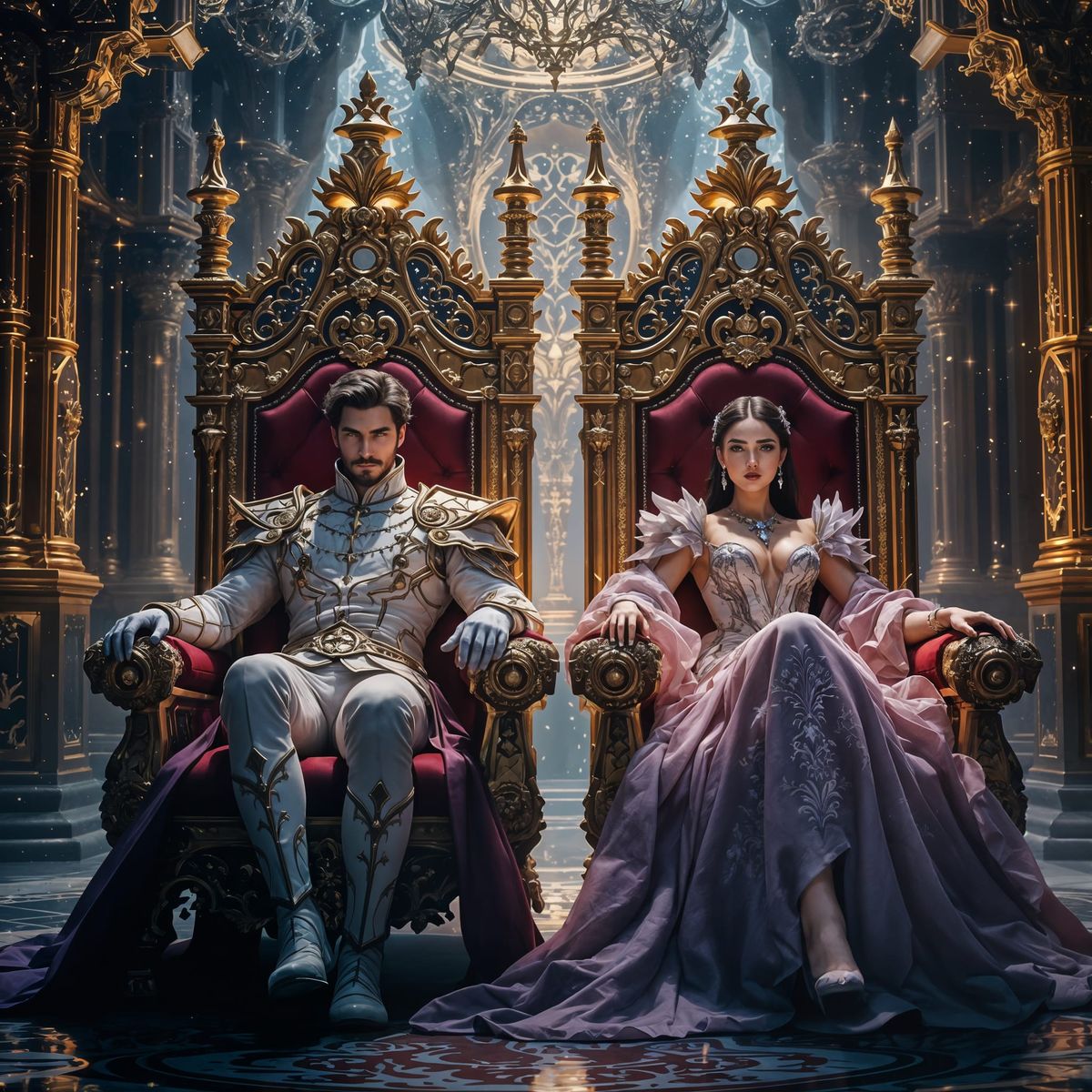 This image shows two siblings, Prince and Princess, sitting side by side on royal chairs, set in a dark fantasy world with intricate details and dynamic lighting.