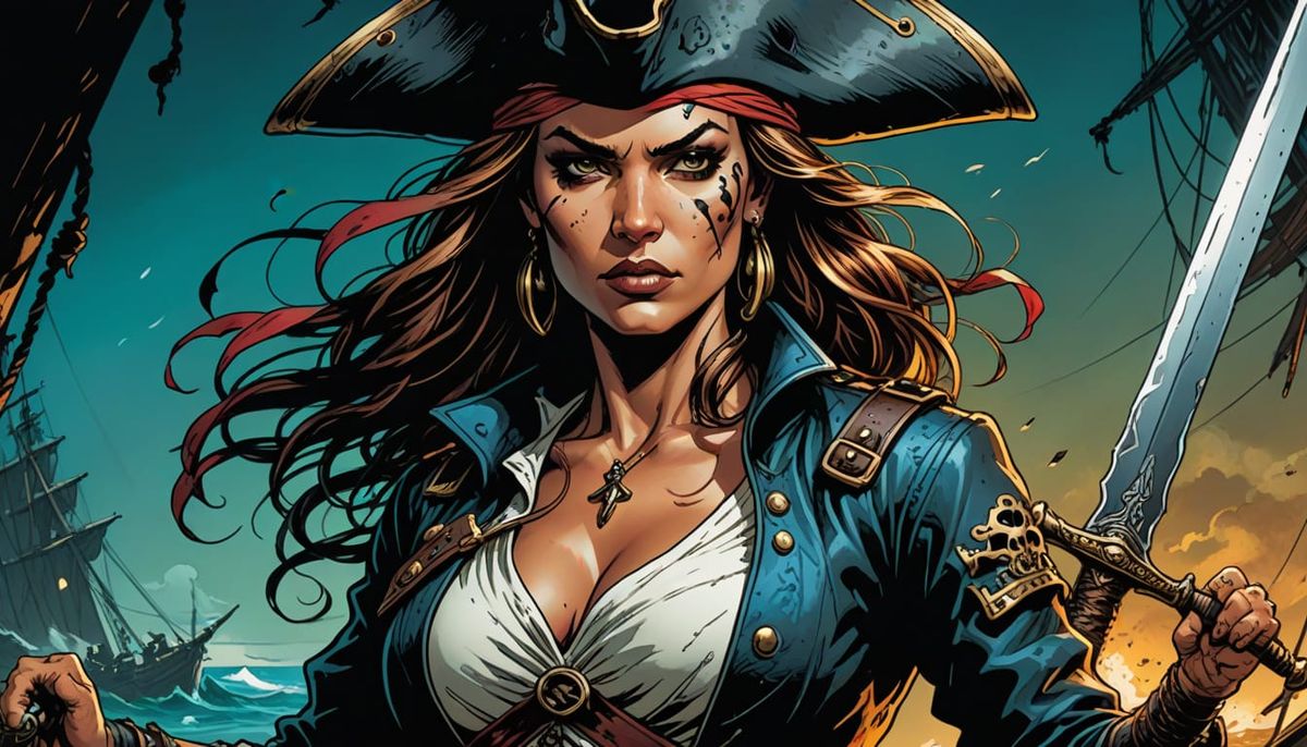 This image shows a close-up of a pirate woman with a sword in a comic book style. It features strong brush strokes, vivid ink lines, and dramatic shading, similar to a graphic novel illustration.