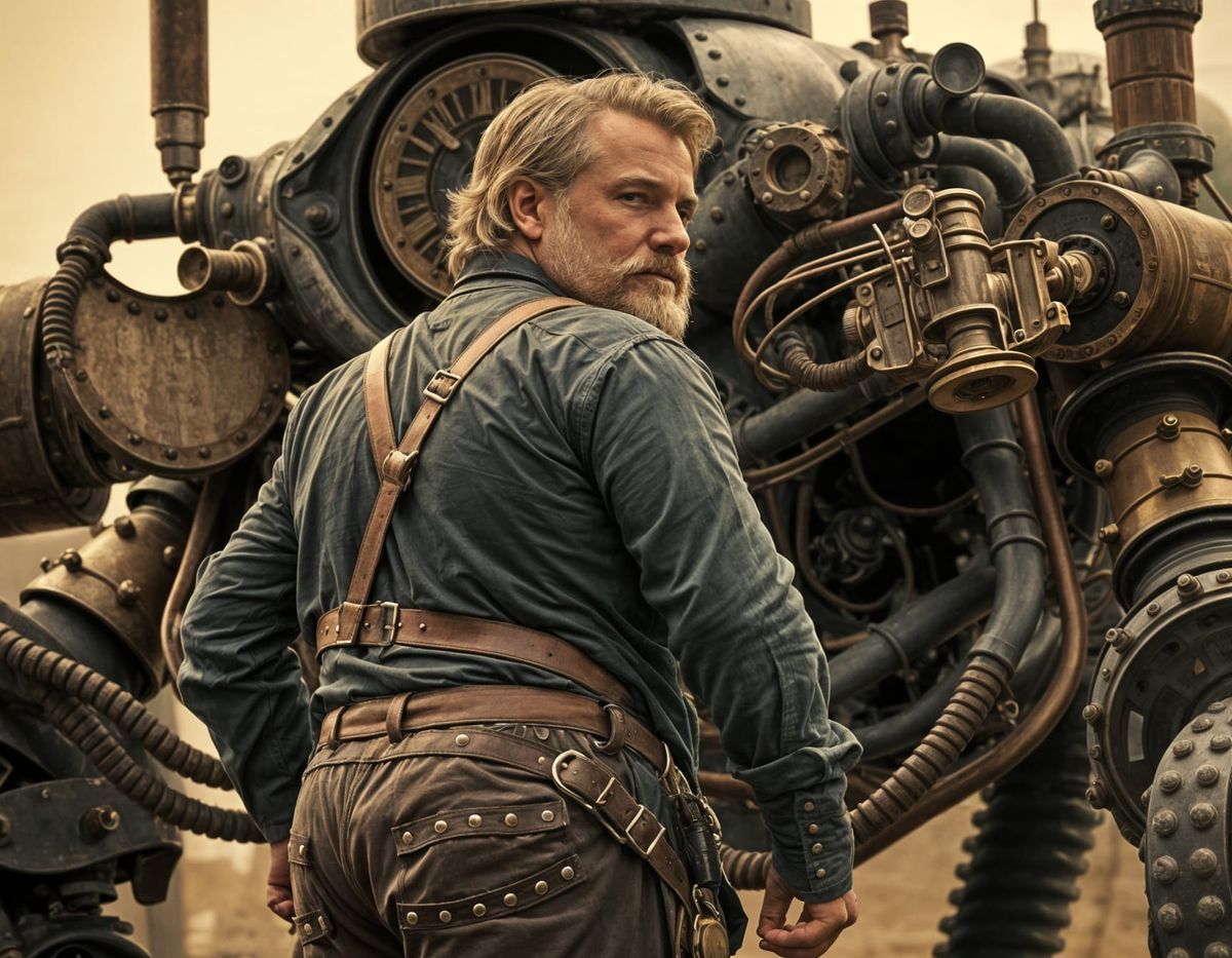 This sepia toned photograph depicts a blond, mustached, middle-aged man with a dadbod stepping into an elaborate steampunk mecha. His pants are falling down, revealing his plumber's crack.