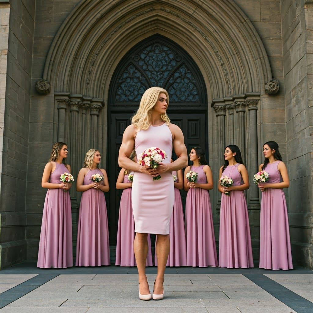 A striking image of a muscular young man in a bridesmaid dress and wig, holding a bouquet outside a church. Captured with professional camera detail and shallow depth of field.