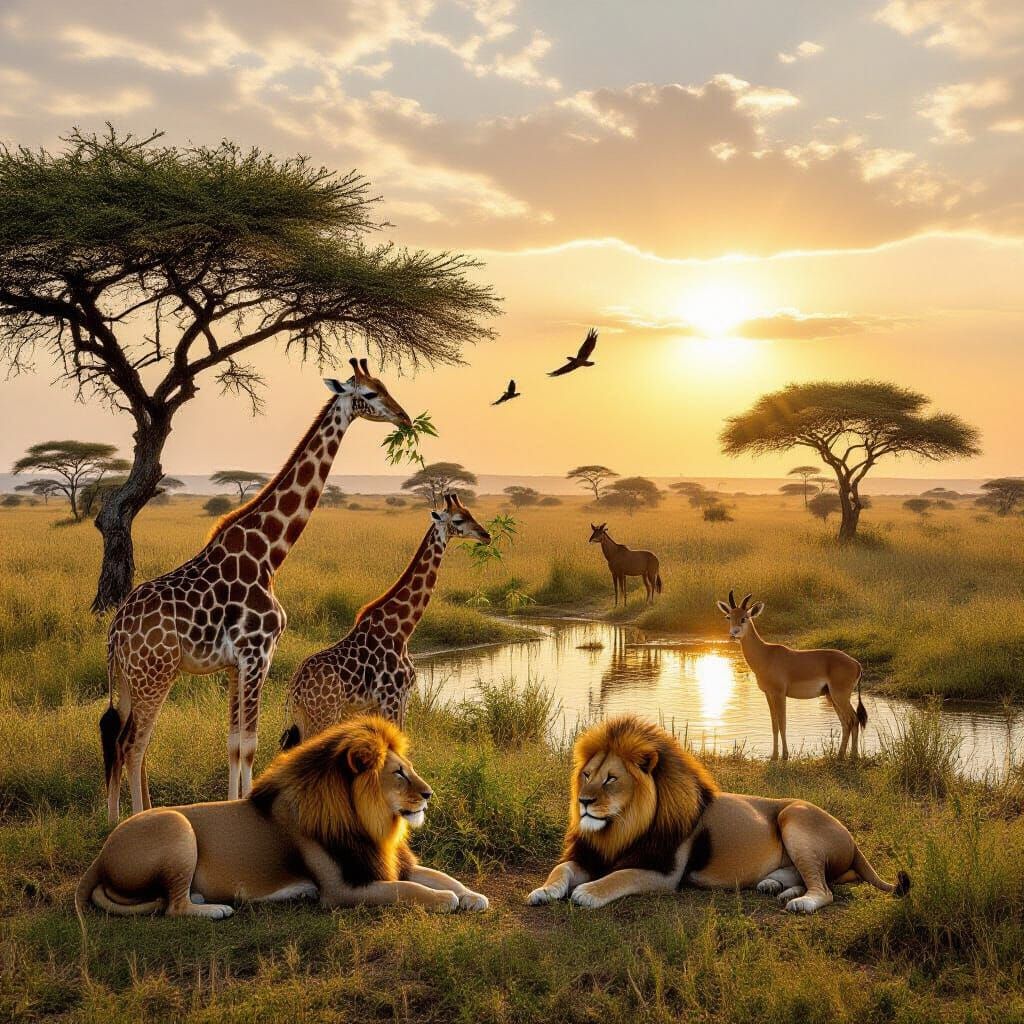 This hyperrealistic image captures an African savanna with giraffes feeding, lions resting, and zebras drinking by a river, all under a radiant sun. An eagle watches from a branch.
