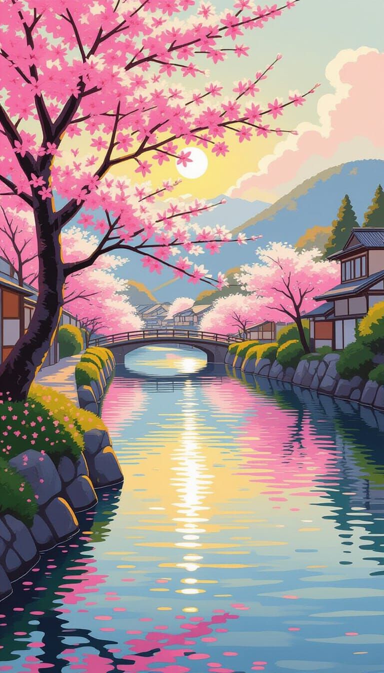 This image shows a vibrant cherry blossom tree by a Japanese river during a golden sunset. The artwork evokes the style of impressionist landscape painting, with soft sunlight reflecting on the leaves.