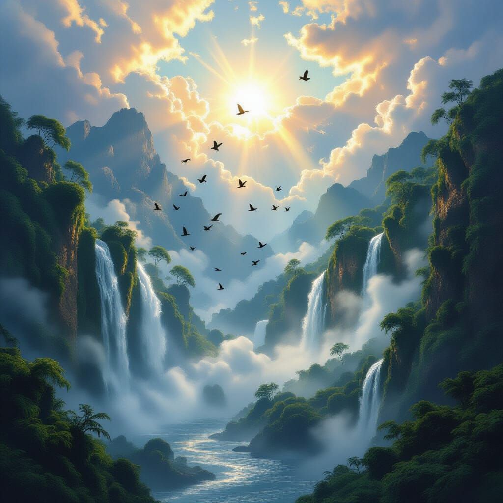 Generate unique nature images with waterfalls, birds, and skies. It's free and easy!