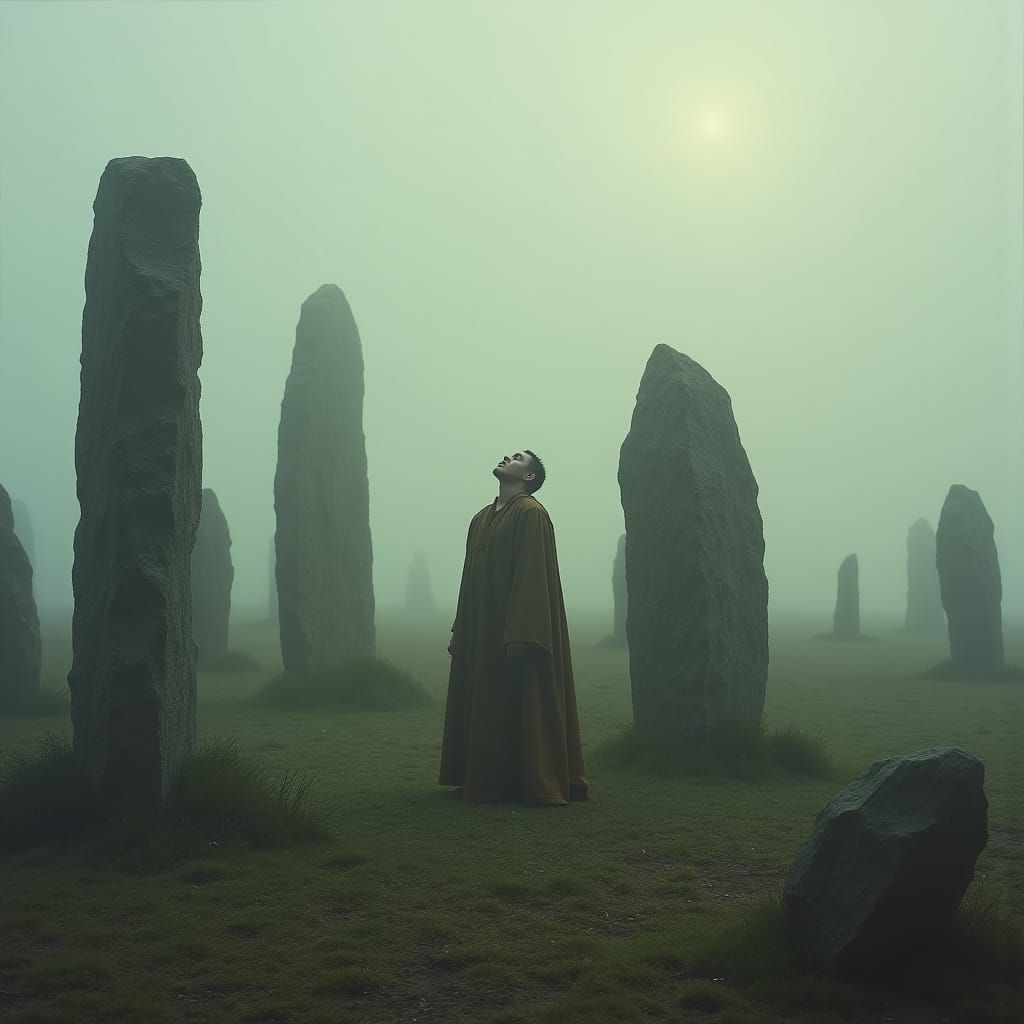 A striking picture of a lone figure in ancient robes standing among Celtic standing stones shrouded in fog. The scene evokes a sense of mystery in a fantasy concept art style.
