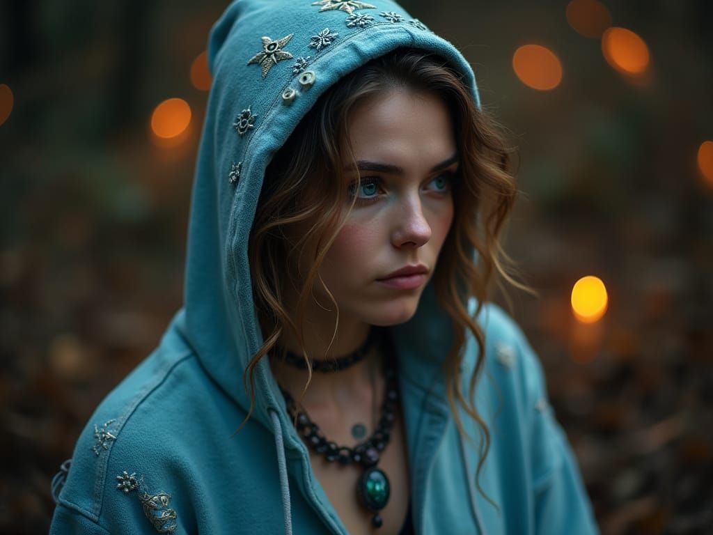 This image shows a woman in an ice blue hoodie with mystical embroidery, against a backdrop of dark orange and black hues. The style is photo-realistic with dark, muted tones and an air of enchantment.