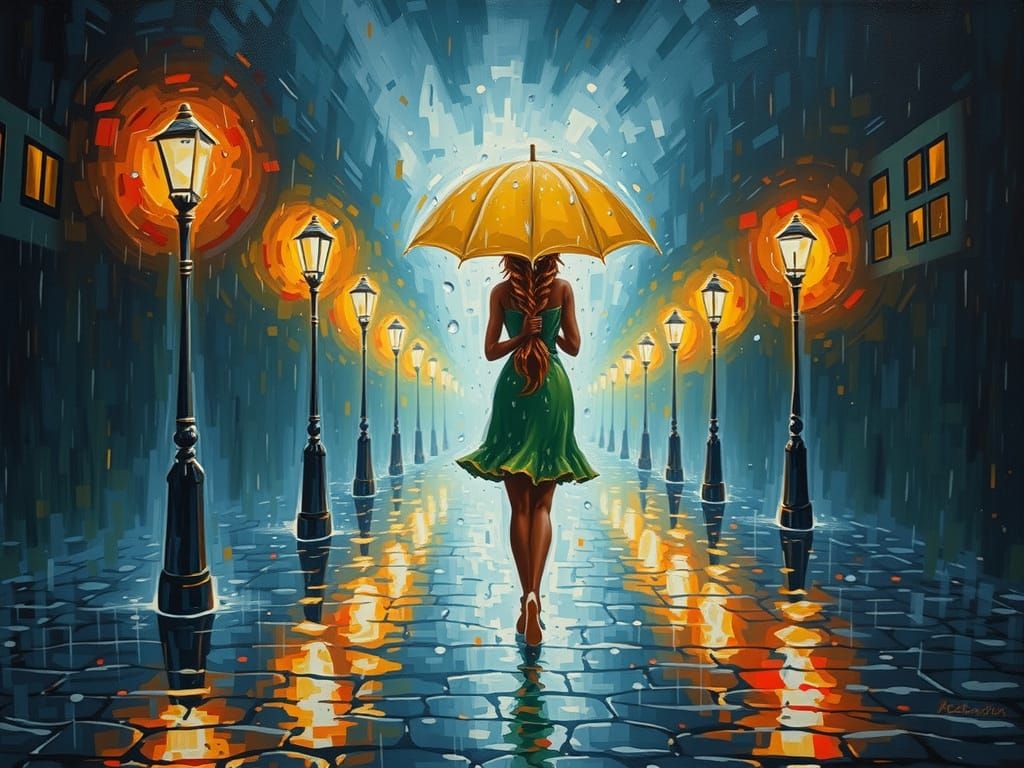 This image shows an African American woman walking in the rain, holding a yellow umbrella. The painting style features thick impasto oil on canvas, with many lit street lamps.