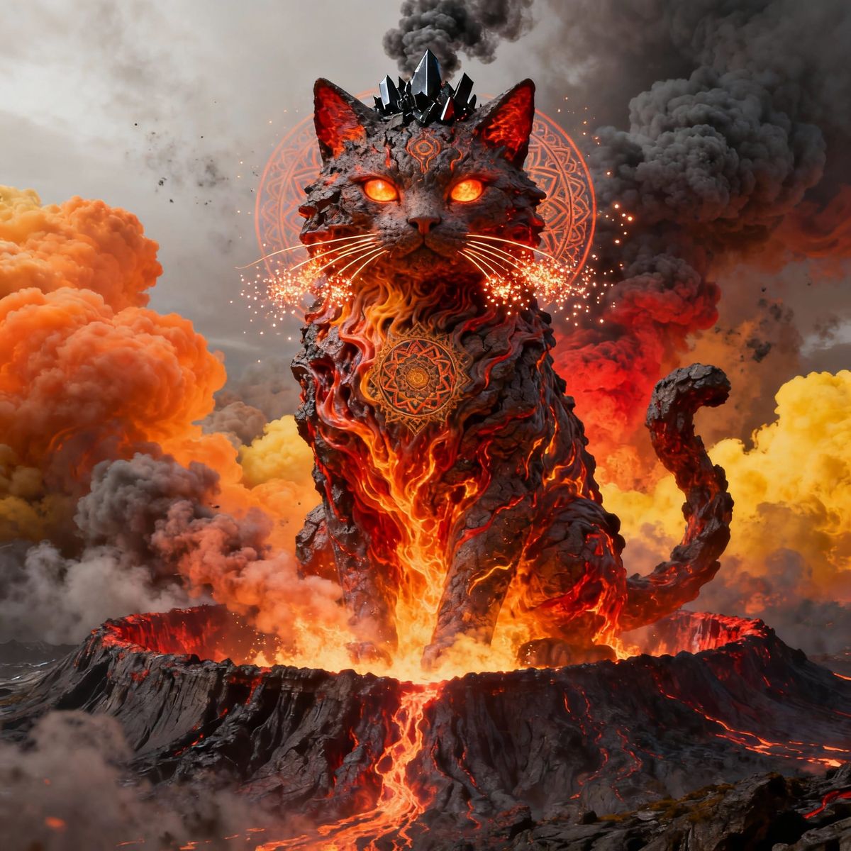 Hyperdetailed surreal digital art depicting a massive cat deity emerging from an erupting volcano. Its form is composed of lava and obsidian, radiating fire and ash, with fractal halos, rendered with dramatic cinematic lighting.