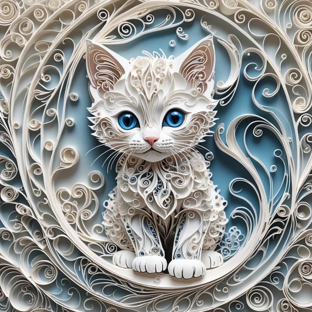 This image shows a charming white kitten with blue eyes, depicted in intricate paper quilling. The artwork features detailed, swirling filigree against a backdrop with a subtle ethereal glow.