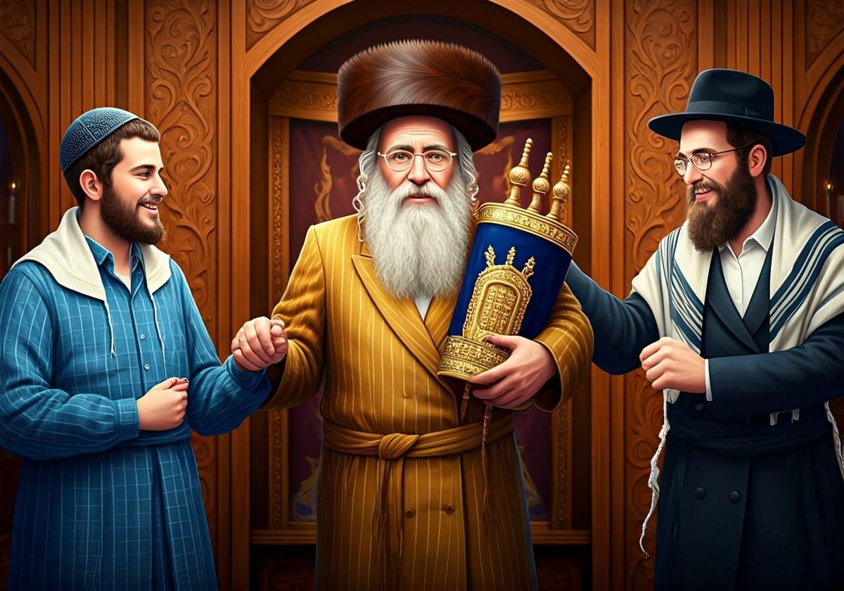 A vivid image showing five Jewish people from different backgrounds dancing in a circle. The joyful figures are set against a detailed wooden ark backdrop, full of intricate detail.