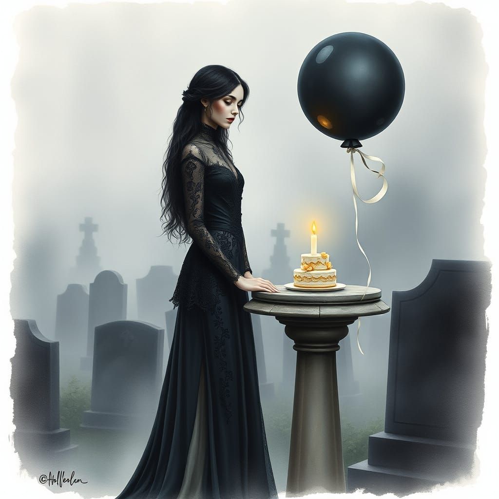 This haunting watercolor image depicts a statuesque maiden in a gothic graveyard, surrounded by mystery and foreboding. A delicate cake and a single candle cast a warm glow, while a large ebony balloon hangs suspended, evoking a sense of ethereal wonder.