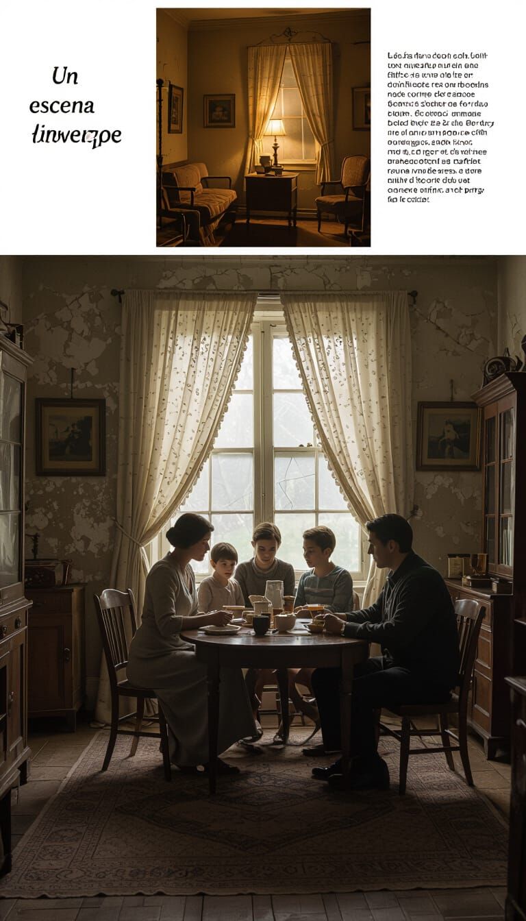 This hyperrealistic image depicts a family in a dimly lit, antique room at night, surrounded by spectral, glowing ghosts. An atmosphere of psychological horror and paranoia pervades the scene.