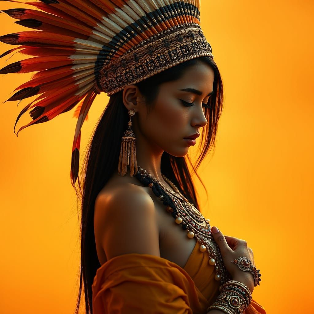 A striking picture of a slender Mexican woman in profile. She wears tribal-style attire, including a feathered headdress and golden jewelry, all rendered with photorealistic detail against a hazy orange backdrop.