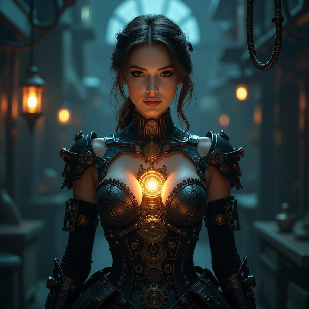 This image shows a woman in a mechanical dress with her chest exposed, revealing a glowing engine. Steampunk gears and copper wiring surround her in a dimly lit, mystical industrial-fantasy setting.