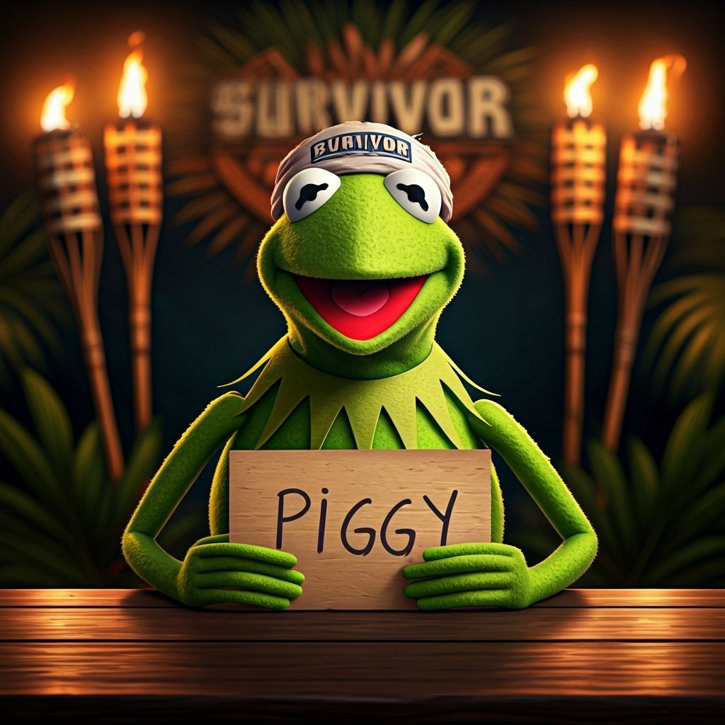 This hyperrealistic image shows Kermit the Frog as a Survivor contestant at tribal council, holding a sign against a tropical backdrop. Cinematic, high contrast, and perfectly composed.