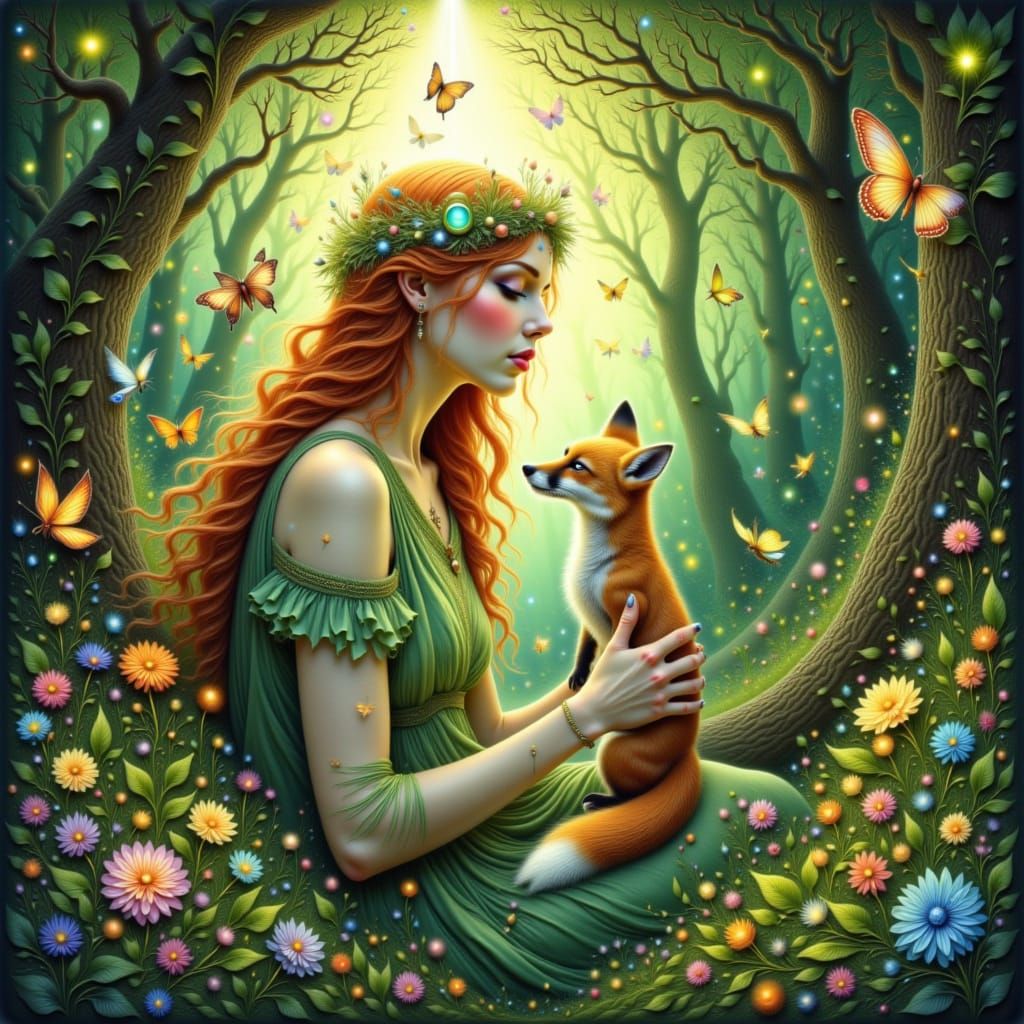 A vibrant forest nymph with auburn hair cradles a fox cub amidst wildflowers and butterflies in an ancient woodland. Art nouveau and fairytale illustration style.