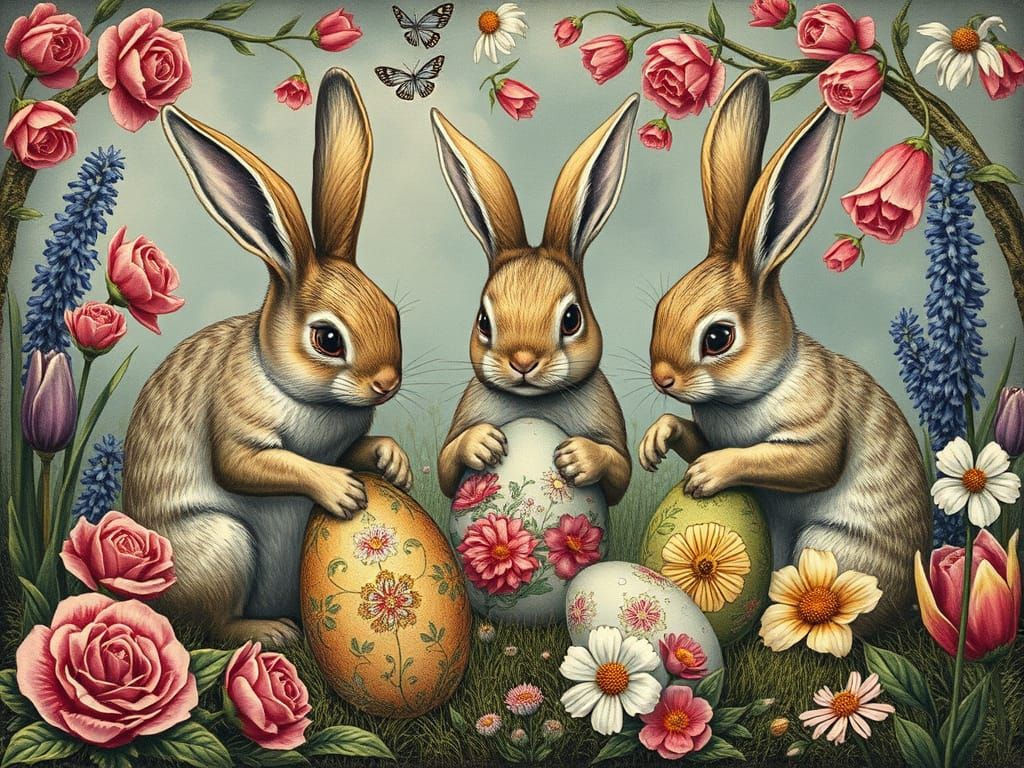 A vibrant vintage-style illustration of three bunnies decorating Easter eggs among roses, tulips and daisies. The image has classic illustrative elements with a dark fantasy aesthetic.