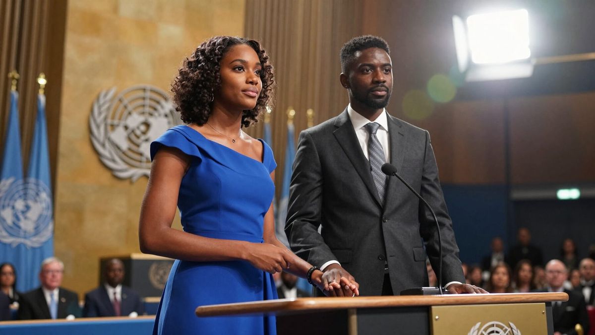 This image depicts a triumphant moment at the United Nations award ceremony. A young African woman in an elegant blue dress accepts an award, holding hands with her proud partner. The scene is captured with cinematic realism, highlighting a moment of global recognition.