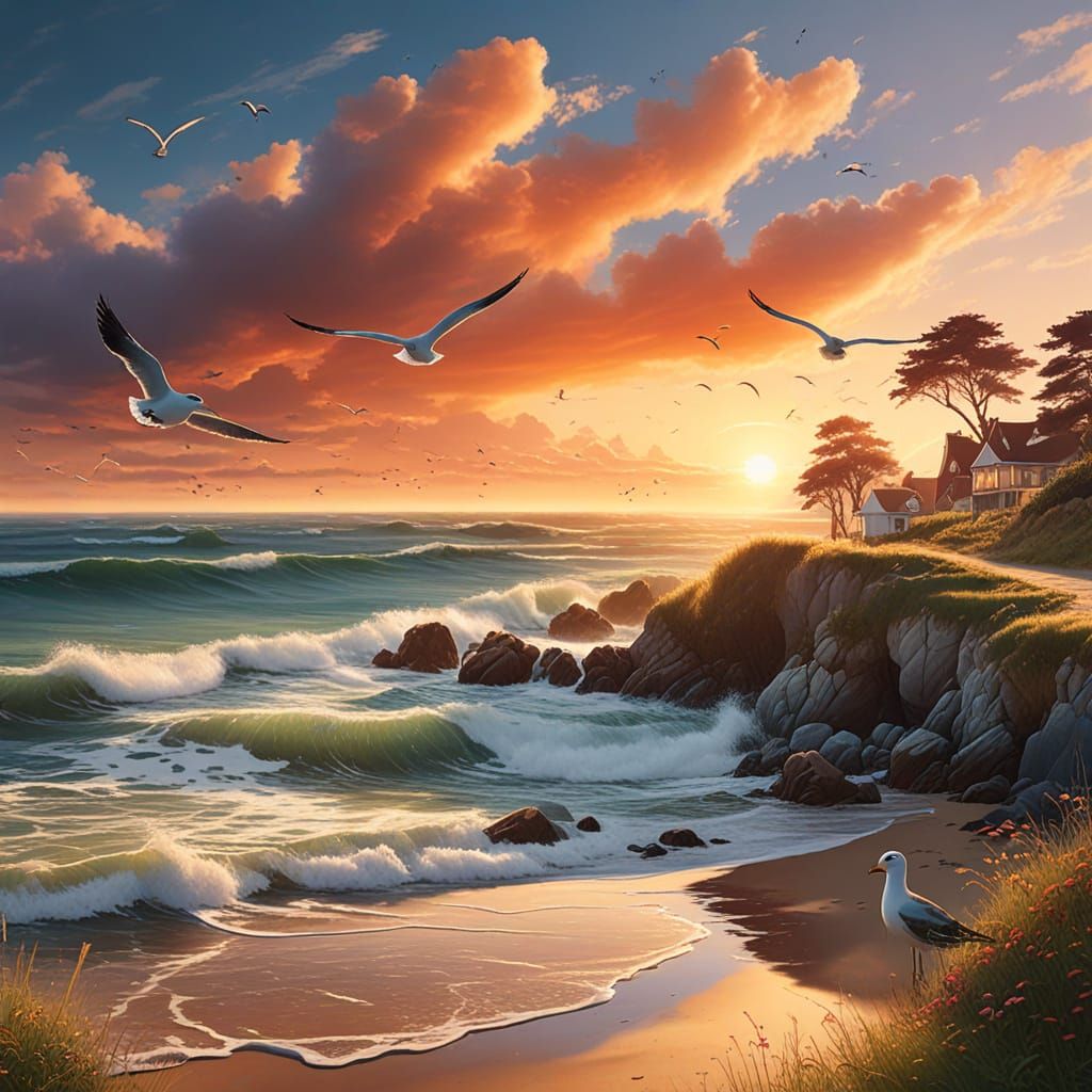 This image shows a scenic summer coastal landscape at dawn with a pair of seagulls in flight. The photorealistic image is full of vibrant colors.