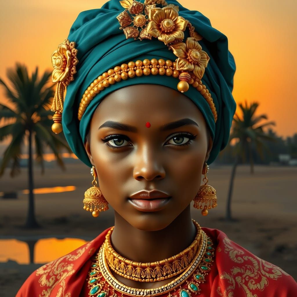This image depicts a dark-skinned woman with a teal turban adorned with gold floral design and a gold beaded crown, set against a warm sunset sky with palm trees in the background. The subject's elegant features and rich, ornate jewelry evoke an ancient or exotic royal aesthetic.