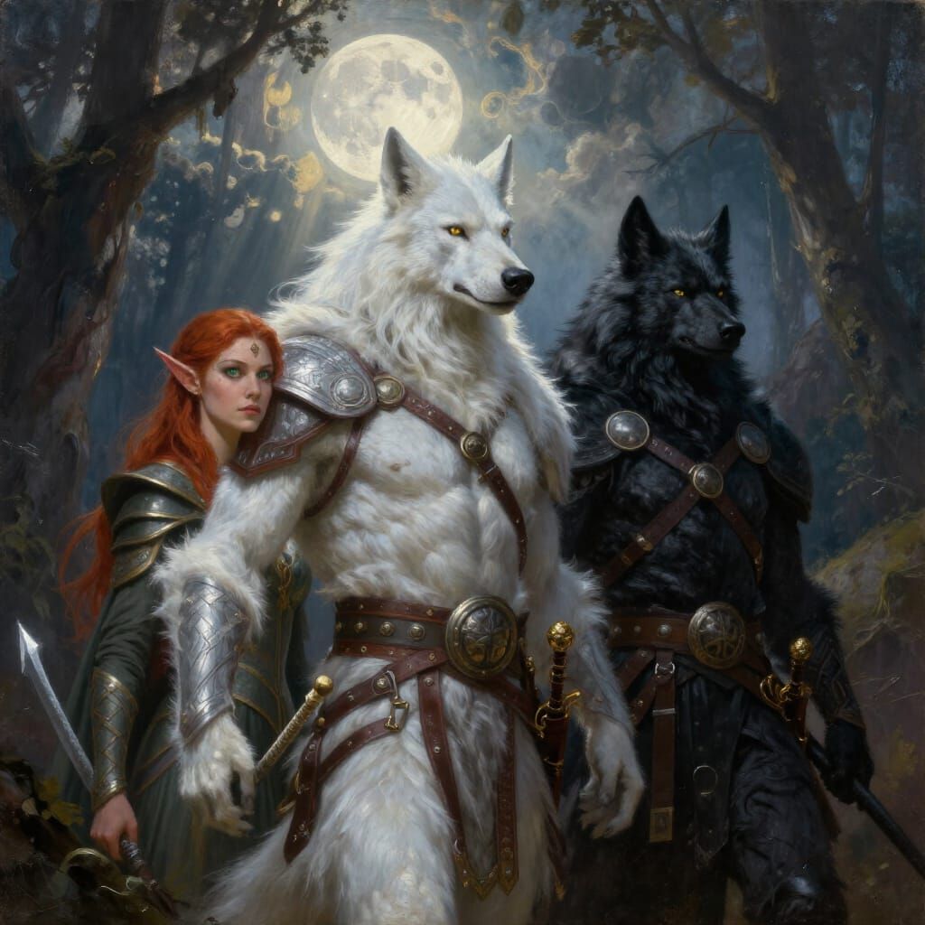 This oil painting depicts a white werewolf king and a black werewolf warrior alongside a red-haired elven queen. Divine light illuminates a dark forest under a full moon.