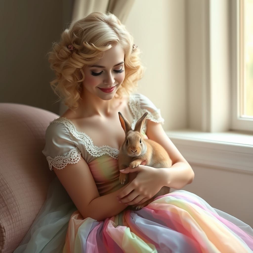 This image depicts a serene and elegant woman cradling a small rabbit, surrounded by a soft, pastel-colored atmosphere reminiscent of classic art nouveau and fantasy illustrations.