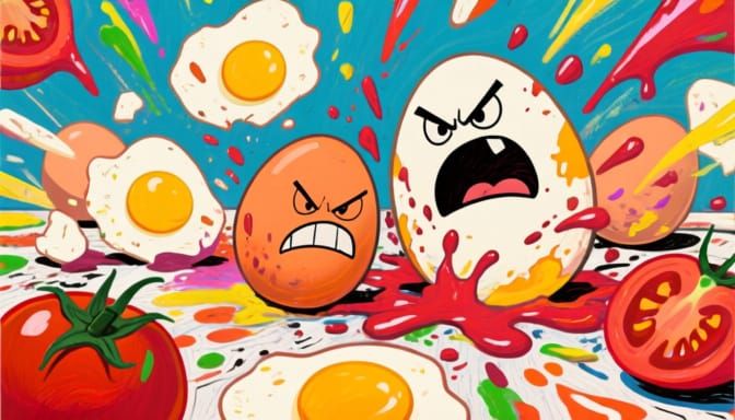 This image depicts a lively food fight scene with angry eggs and splattered tomatoes, rendered with bold lines and vibrant colors.