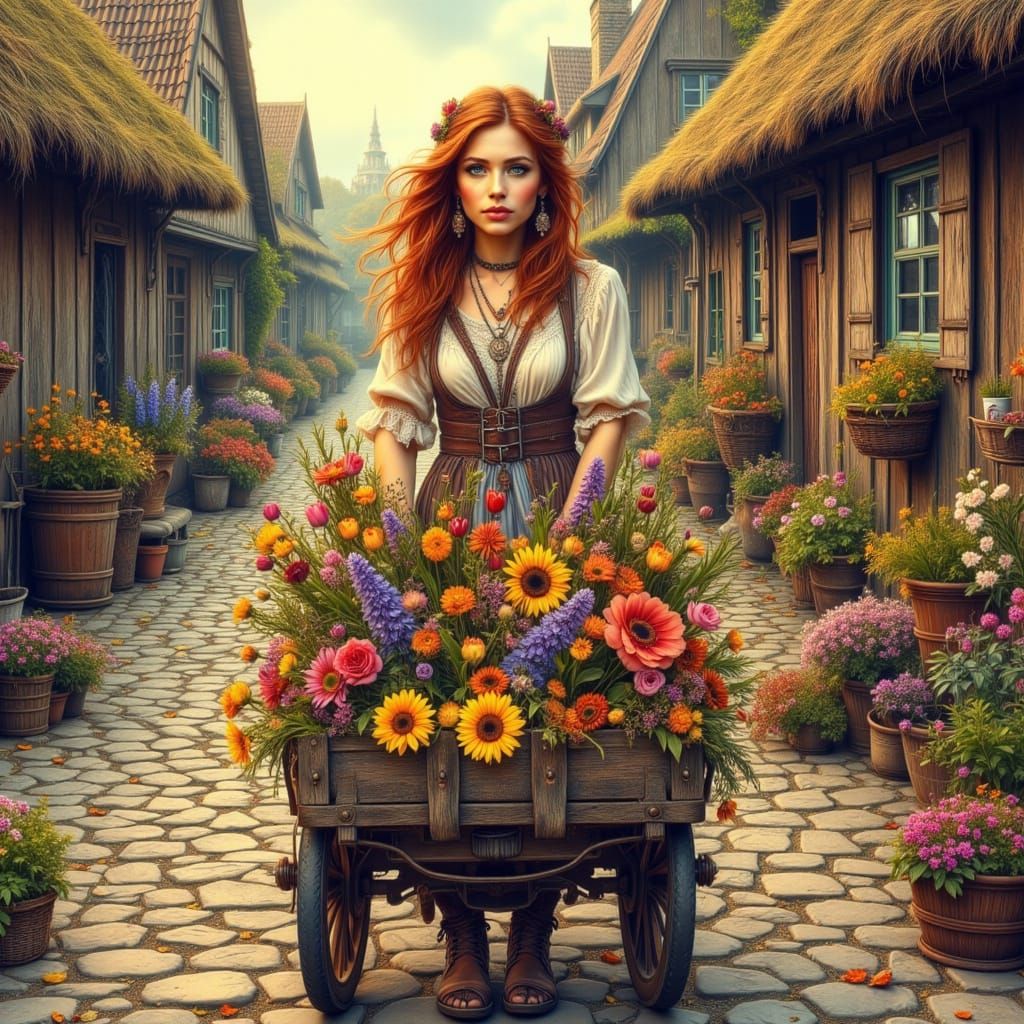 This image shows a picturesque bohemian scene of a woman selling flowers in a charming village. The artwork features vibrant colors, Art Nouveau influences, and a mix of flowers in a hand wagon along a cobblestone street with thatched-roof cottages.