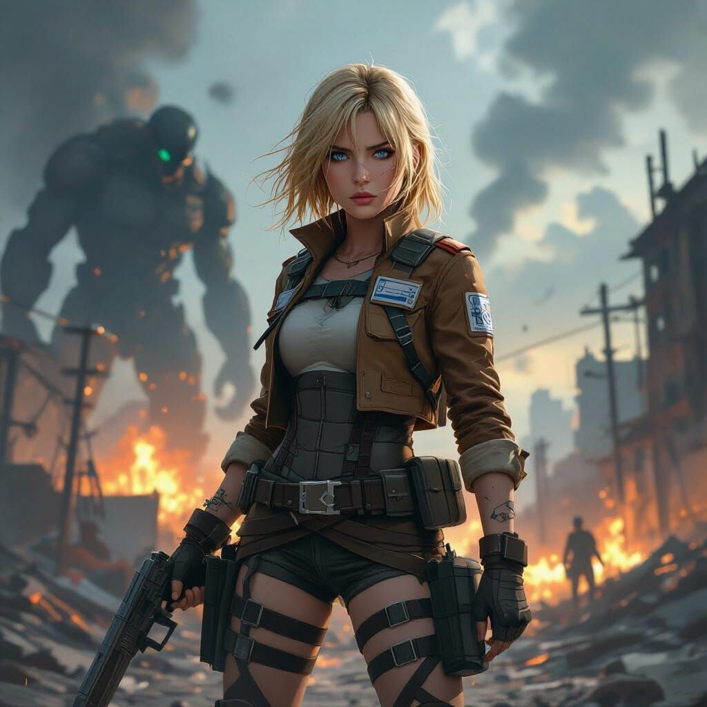 A depiction of a young woman with blonde hair and blue eyes in a military uniform, engaged in combat with Titans within the destroyed Shinganshina District. The image has dramatic lighting and a dystopian atmosphere.