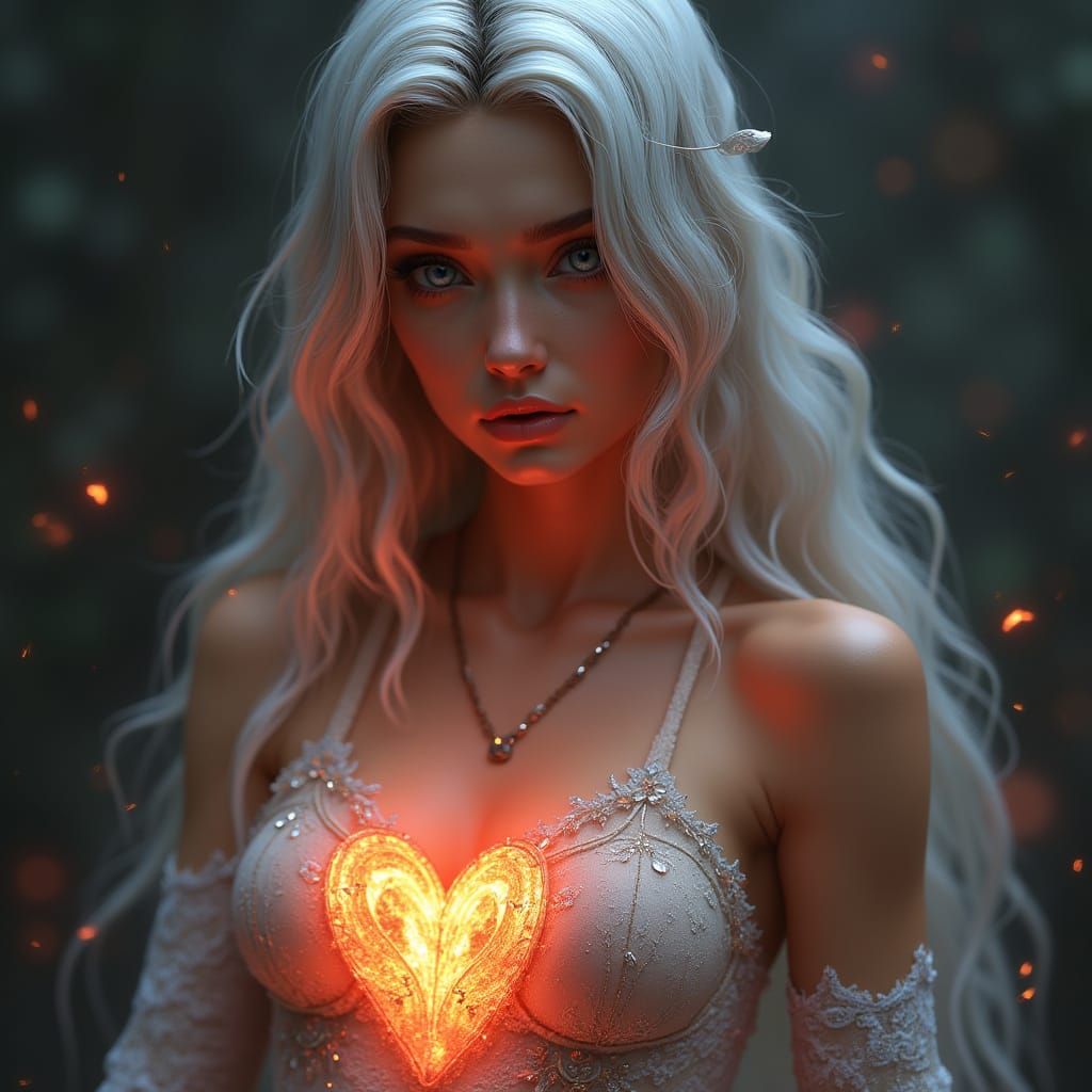 This image shows a slender girl with long, silky silver hair and bright blue eyes. A fiery mark pulsates above her heart in this detailed 3D portrait. The artwork evokes digital art with vibrant textures.