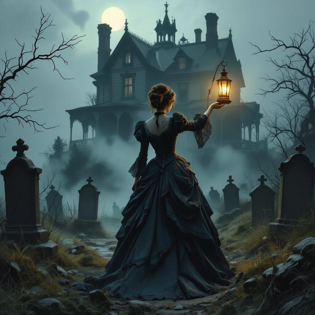 A striking picture of a woman in a tattered Victorian dress holding a lantern before a dilapidated gothic mansion. The digital painting style features impasto brushstrokes and moody, dark aesthetics.