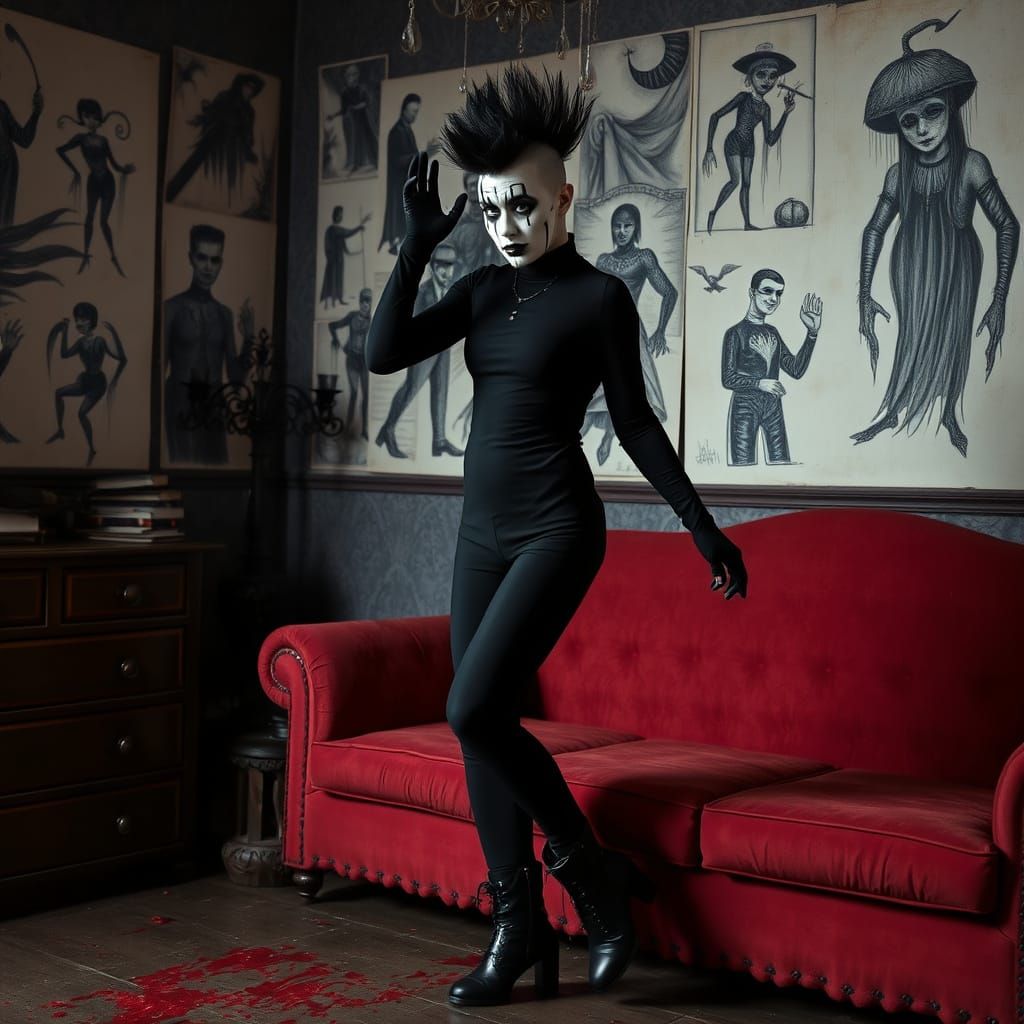 A woman dancer in a dark, untidy room with Gothic charcoal drawings on the walls, surrounded by a blood-red sofa and a wormwood chest of drawers, painted in a dark, moody aesthetic