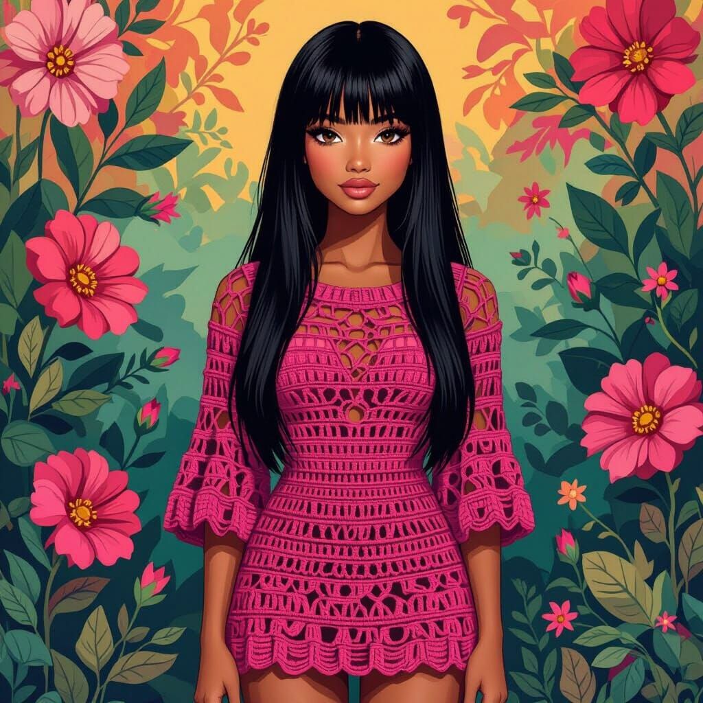 A vibrant image of a brown-skinned girl with long black hair, wearing a pink crochet mini dress. The artwork features bold colors and intricate textures, in a digital art style.