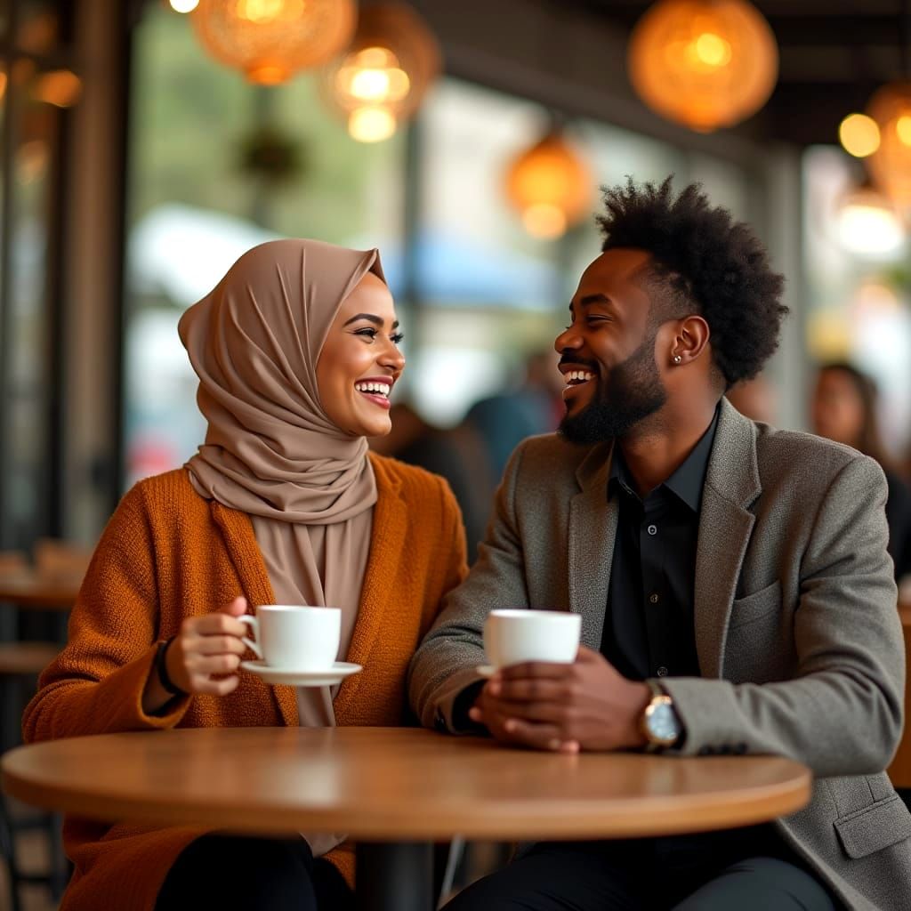 This image shows a stylish Muslim couple enjoying a warm moment over coffee in a chic cafรฉ, exuding effortless joy and intimacy. The atmosphere is filled with a sense of lightness, familiarity, and genuine delight, inspired by vibrant colors and bold patterns reminiscent of a sunny afternoon in a bustlin...