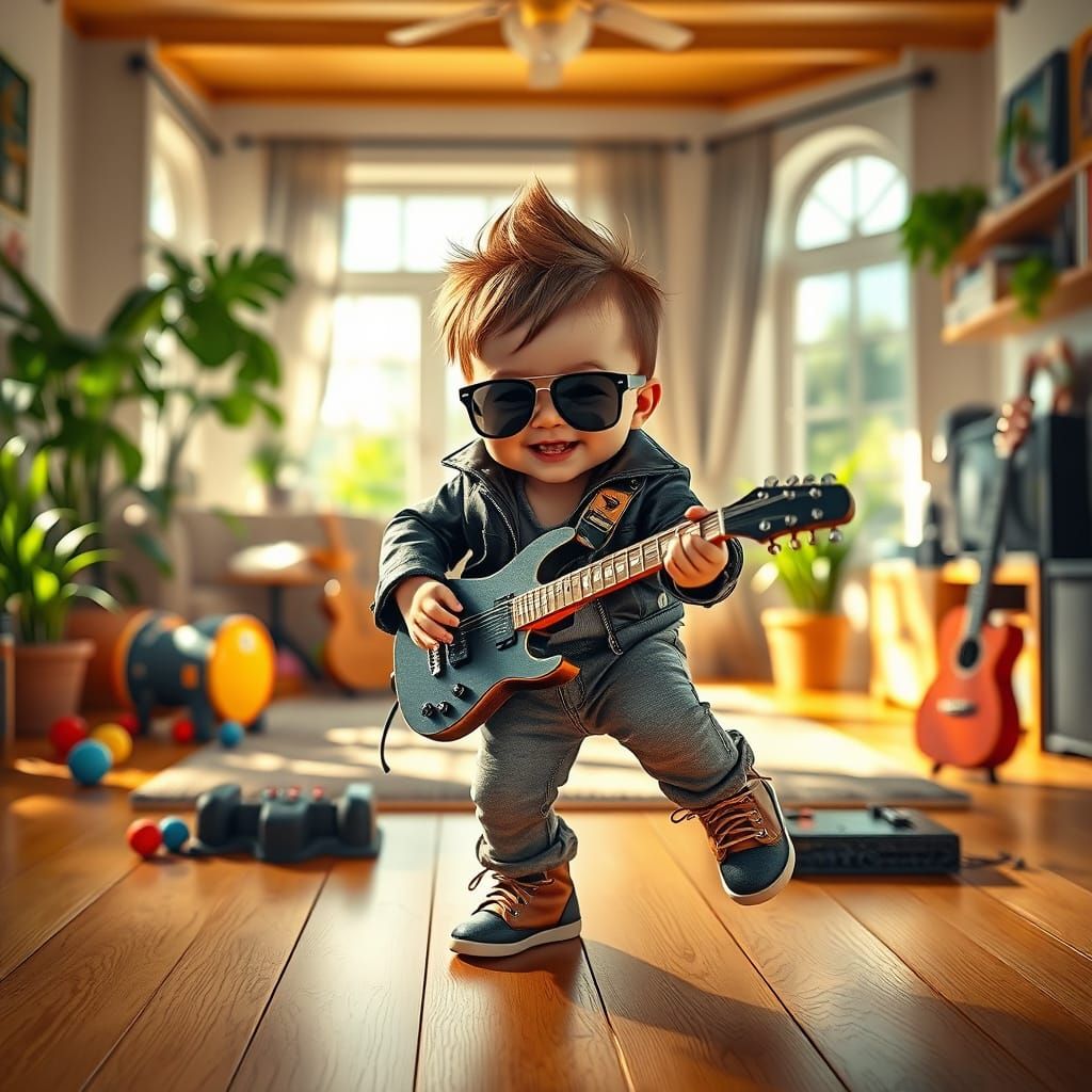 This image shows a joyful baby boy dressed as a rock star, dancing in a sunlit living room with warm wooden floorboards and lush green plants, surrounded by colorful toys and music instruments, in a photorealistic style reminiscent of digital art