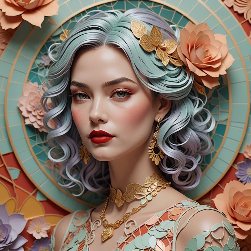 Render in 8K resolution, hyper-realistic fantasy realism style, emphasizing the precision of the paper-cut aesthetic, with ultra-detailed textures: the layered intricacy of her hair, the smooth sheen of her lipstick, and the tactile quality of the background patterns. gious mood to captivate viewers ...