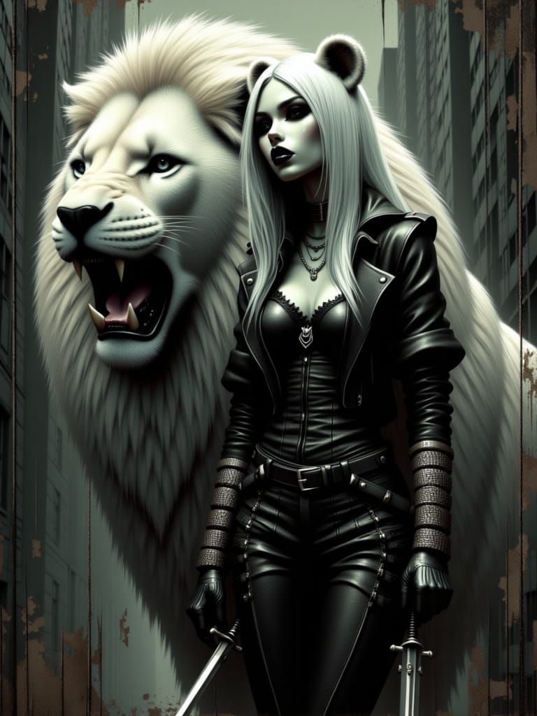 This image shows a gothic, grunge-style warrior woman with a white lion. She is armored in leather and carries a silver sword in this fusion of dark romance and urban style.