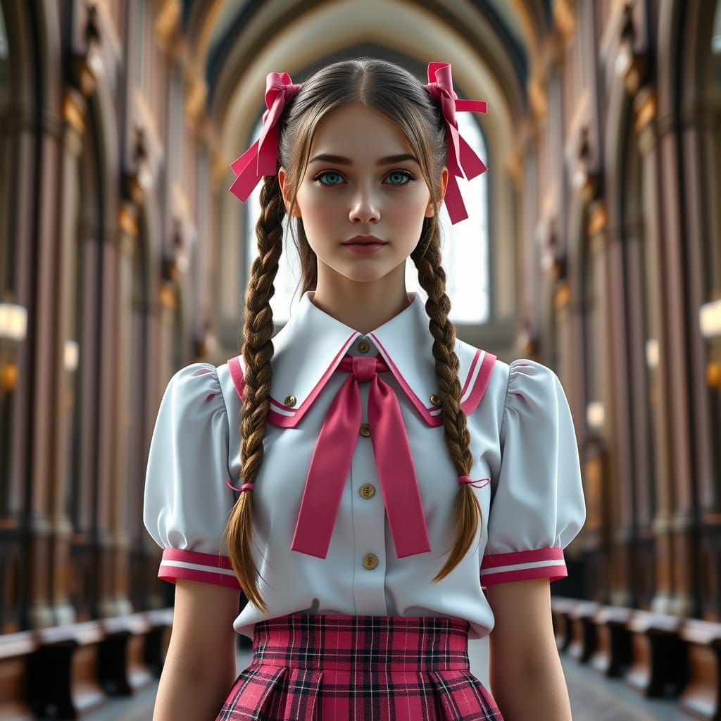 A stunning, cinematic portrait of a young woman in a modernized schoolgirl uniform, standing regally in a grand cathedral as the ruler of the underworld, with intricate details and a dramatic, atmospheric background.