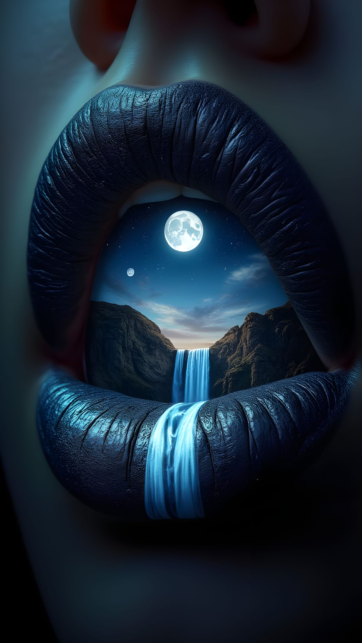 This image shows a striking close-up of painted lips, with the upper lip illuminated by a full moon and the lower lip featuring a dramatic landscape of cliffs and waterfalls under the same lunar glow.