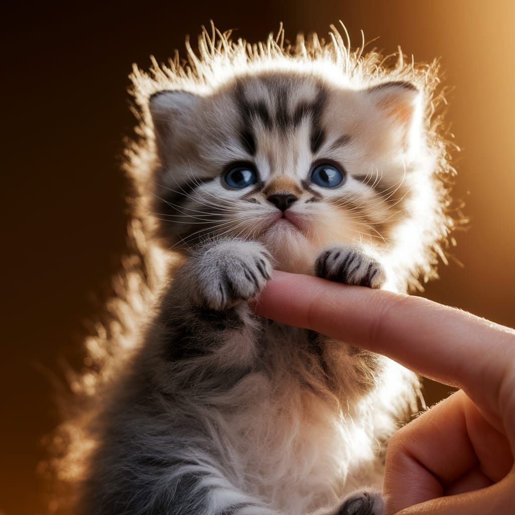 This heartwarming image shows a tiny kitten with soft fur and big blue eyes holding onto a human finger. The scene is bathed in warm, golden light, creating a sense of intimacy and connection between the kitten and the person.