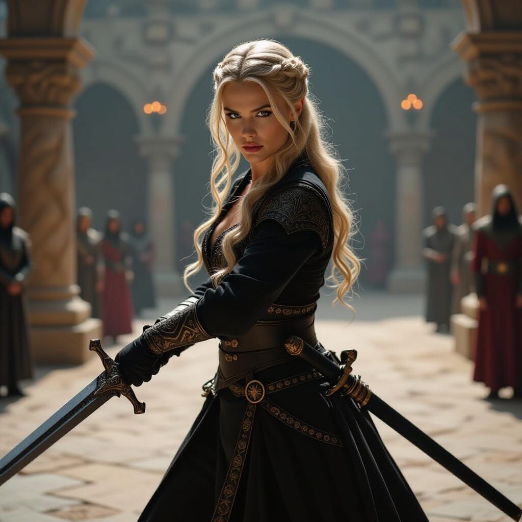 This image shows a dramatic, cinematic scene of a blonde-haired, blue-eyed warrior striking down her father. The color palette and lighting evoke an atmospheric and epic visual masterpiece, reminiscent of cinematic film.