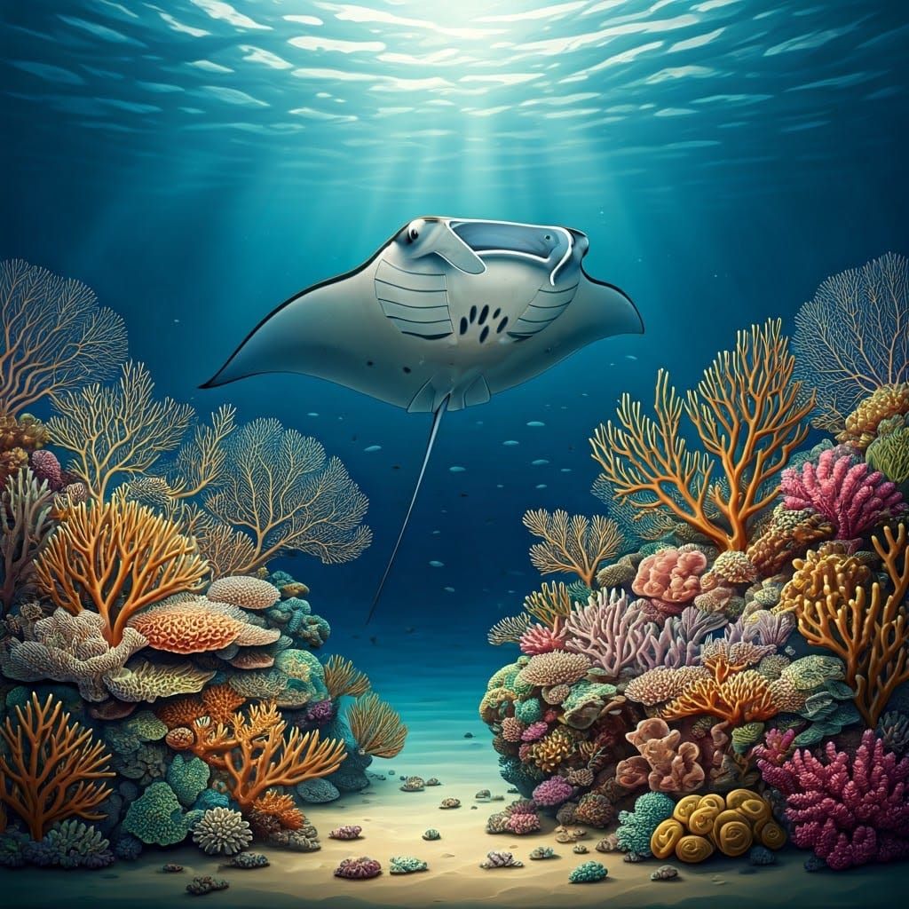 Dive into AI image creation! Easily generate your own breathtaking manta ray and coral reef scenes for free.