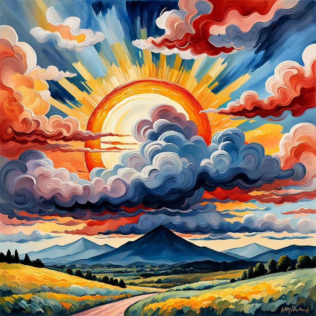 A vibrant painting of a sun obscured by clouds, rendered with thick brushstrokes and layered textures. The artwork evokes a sense of dramatic, impressionistic beauty in a gouache style.