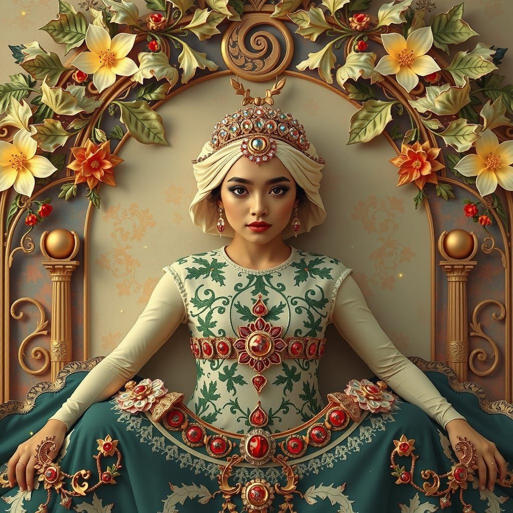 This image shows a woman with dark hair and pale skin wearing a flowing gown. The background is a starry night sky featuring nautilus and fibonacci curves, rendered as photorealistic 3D art.