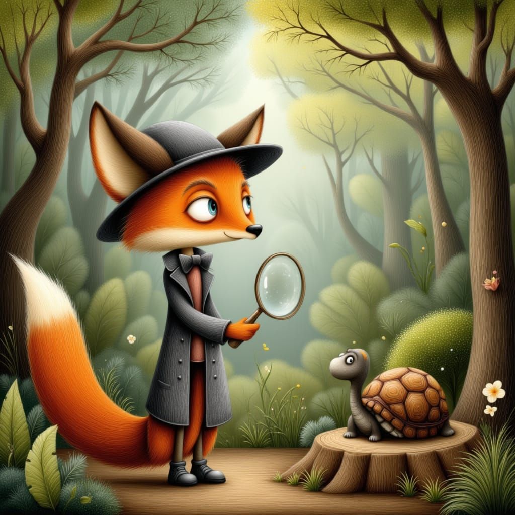 A serious squint eyed fox dressed as Sherlock Holmes and holding a magnifying glass. Sherlock fox is speaking to a nervous turtle who is seated on a tree stump. Forest setting. Storybook, vivid colours. In the style of <lora:Cute Story Book:0.6>, <lora:Painterly:0.7> , <lora:FWD-FlatWhimsyDetail:0.7> ...